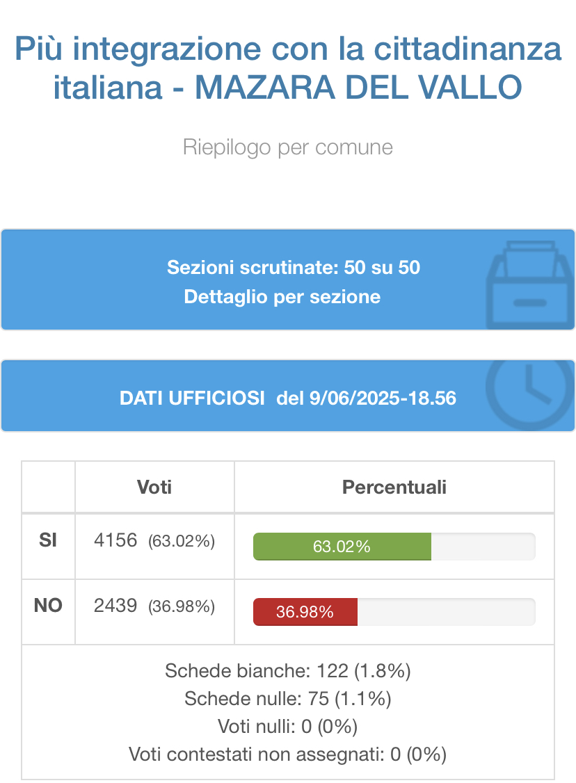 Spoglio delle schede terminato. In allegato le grafiche dei singoli quesiti referendari. Per tutti i risultati: https://elezionimazaradelvallo.maggiolicloud.it/web2506/referendum/AFFLTOT_1_81012.xml